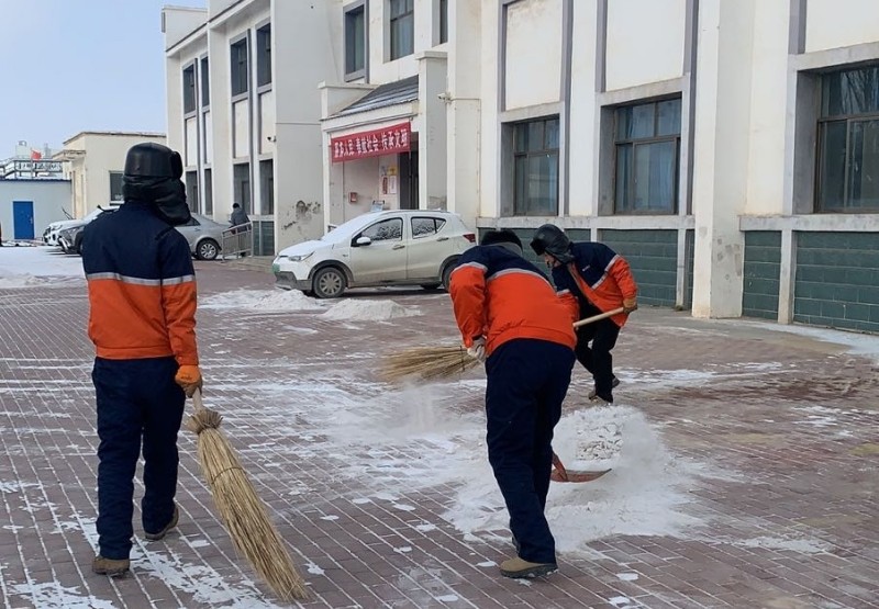 一早,大家分工有序,配合默契,干劲十足,挥舞着扫帚、铁锹等除雪工具,你铲我扫,一派热火朝天,将雪先扫到一处处集中堆放,再齐心协力搬运至墙角,不给“安全隐患”留机会。尽管戴着棉帽子,脸却冻得通红,但手中的工具却也丝毫没有松懈,除雪的身影依旧坚定稳健。天气虽冷,劳动的热情却温暖了整个冬日,整洁的工服亦构成一道道亮丽的风景线。