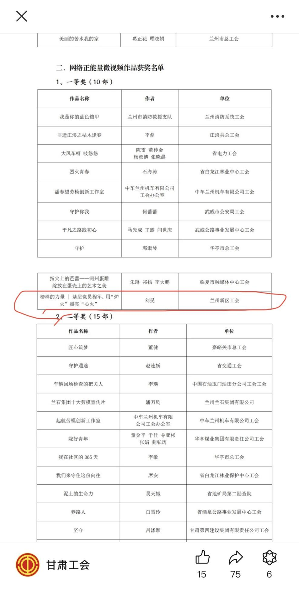 近日,甘肃省总工会和省委网信办联合开展的2024年“网聚职工正能量 争做甘肃好网民”主题活动获奖作品名单公布,由化工热电有限公司工会主导拍摄,石化集团工会监制审核,经兰州新区工会推荐的视频作品《榜样的力量 | 基层党员程军:用“炉火”照亮“心火”》在甘肃省1515部优秀作品中脱颖而出,荣获一等奖。