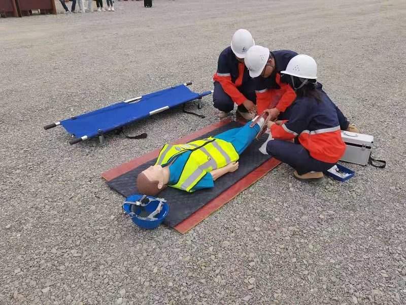 演练地点选择存在高处作业风险的装卸车栈台管廊桥架,模拟了施工人员不慎从高处作业平台坠落的情景。事故发生后,现场安全巡检人员第一时间向应急救援领导小组组长报告,组长立即启动应急救援预案。各小组奔赴现场后,立即分析现场情况,警戒组拉设警戒线封锁现场,医疗救护组立即对伤着进行现场急救,工程抢险组对现场道路进行疏通,各救援小组各司其职,迅速开展应急救援和抢险。