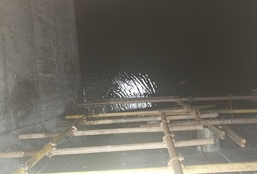 闭水试验是池体施工质量总体检验的必要环节之一。为加快推进项目建设进度,石投集团博石环保有限公司与施工单位中铁二十一局积极沟通,明确施工方案,确定实验日期,要求中铁二十一局严格按照施工计划执行,并指定专人负责,从管道施工、池底平整、脚手架拆除、废料清除、预埋管口及进出口的临时封堵、输水管道的敷设等环节层层把控,督促中铁二十一局做好闭水试验前的各项准备工作。在闭水实验过程中,博石环保公司要求中铁二十一局随时对池体进行外观检查,观测底板、池壁是否漏水,发现渗漏点要做好标记并及时处理解决。经过连续三天的持续观察和记录后,若无渗漏才可逐步排水。