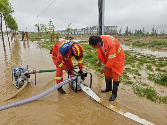 面对这一紧急情况,石化集团久泰服务公司迅速联合秦川园区消防队展开抢险救援行动,此次应急救援队伍共计人力108人,清扫车2辆,水车4辆,消防车2辆,水泵5台,处理路面积水区域 8 处,累计抽水900余方,对 6 处路面淤泥进行了清理,并成功恢复车辆通行道路 3 处。